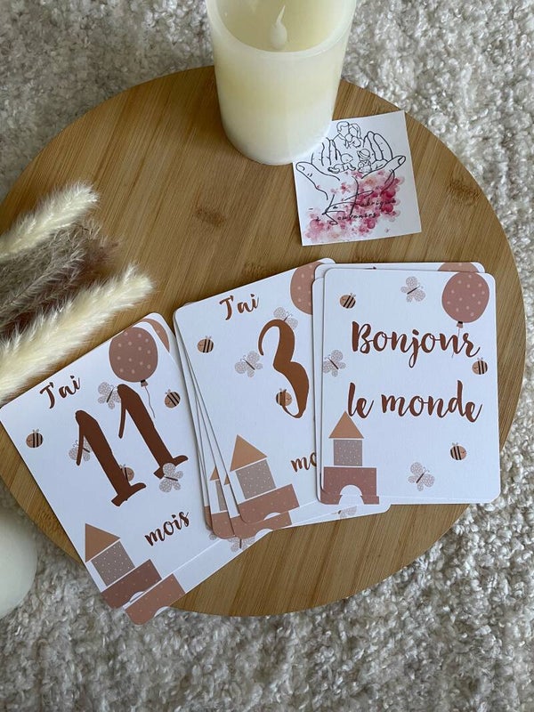 Ce kit comprends la carte "bienvenue le monde" "j'ai 1 mois" jusqu'à "j'ai 1 an".