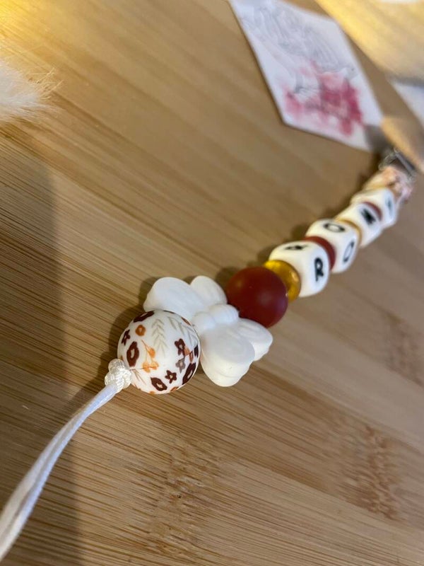 En fonction de la longueur du prénom(maximum 7 lettres), il est succeptible d'être légèrement modifié (ajout ou enlèvement de certaines perles).