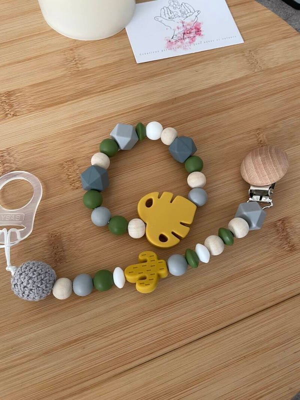 Joli duo attache tétine et anneau dentition nature moutarde !