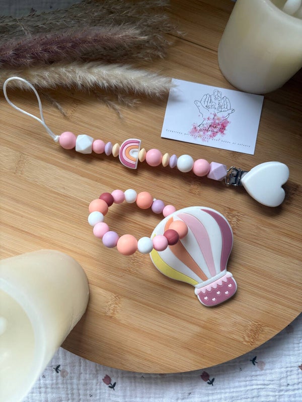 Ce coffret naissance comporte un attache tétine arc en ciel rose et un anneau de dentition montgolfière rose.