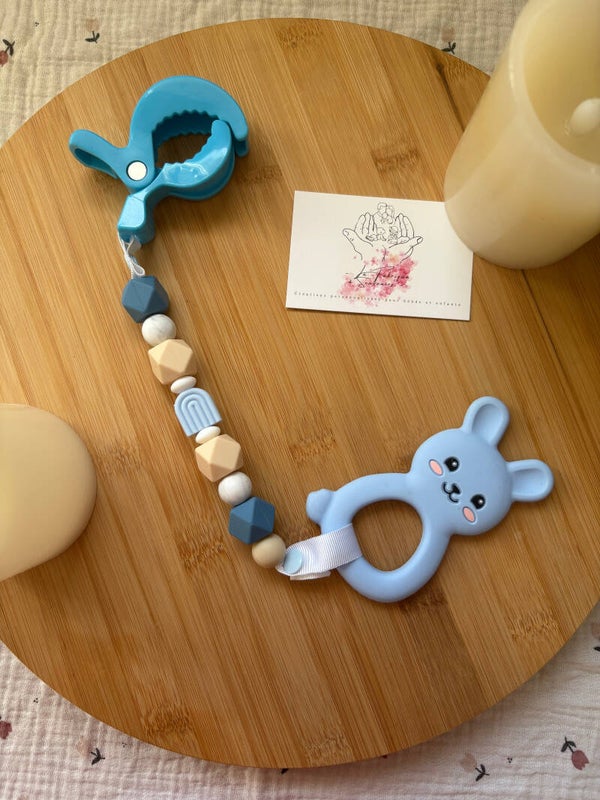 A l'aide de la pince, il est à accroché sur le portique d'éveil, poussette, landeau ou même au dessus du siège auto ! Au bout de ce jeu est accorché un anneau de dentition qui peut être décroché et échangé avec un autre jeu.