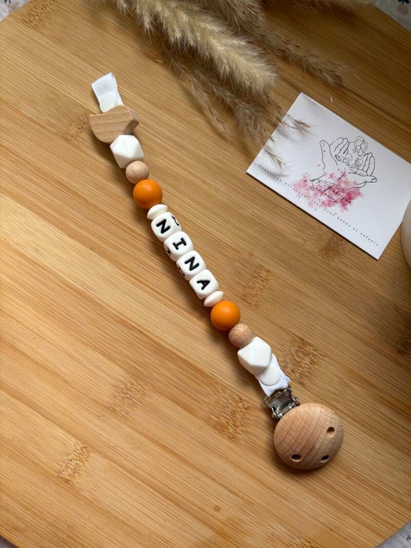 L'attache tétine mesure 22 cm maximum. L'attache tétine est entièrement personnalisable. Il est fait de perles en silicone alimentaire te de perles en bois de hêtre adaptés pour bébé.