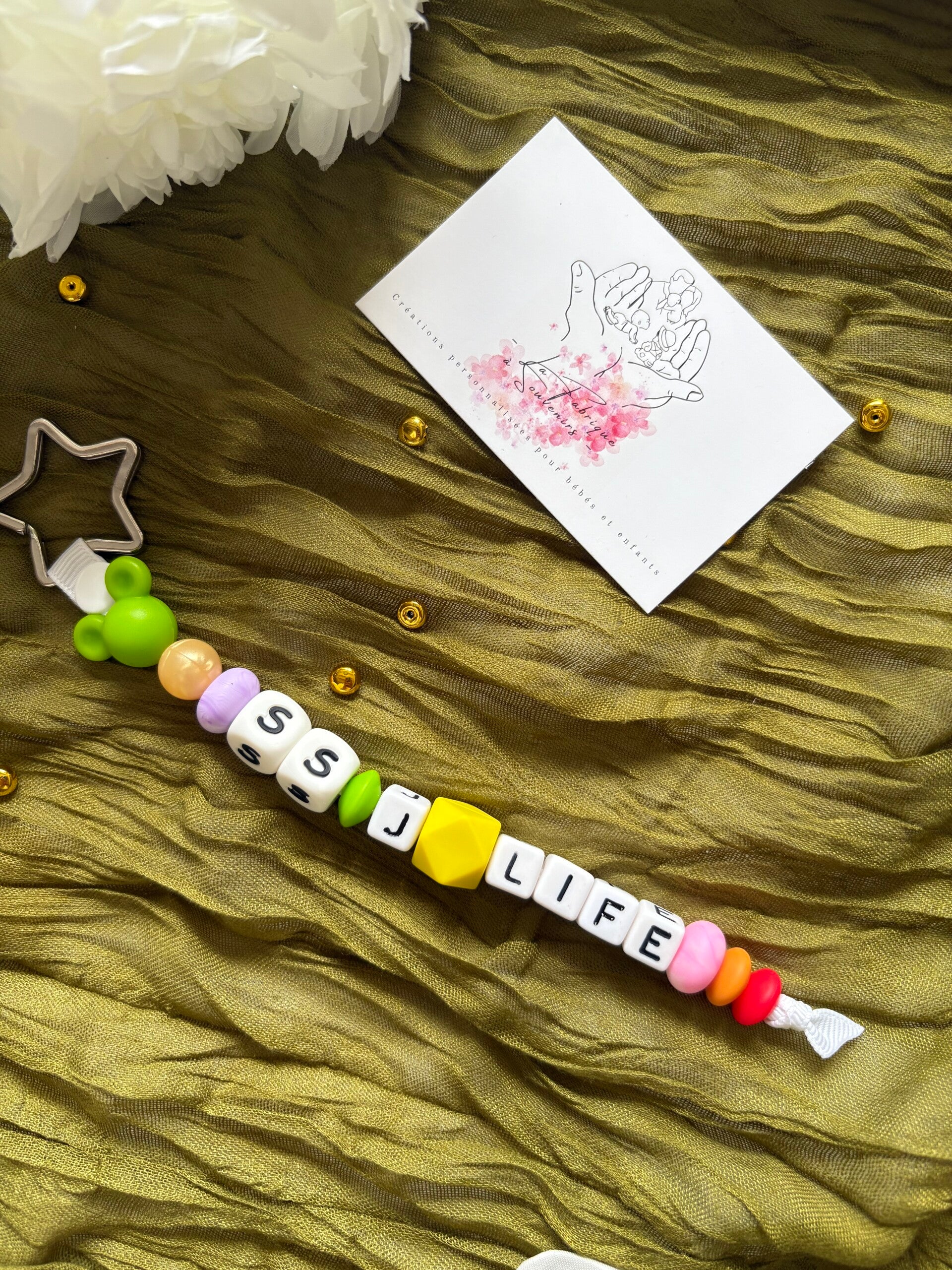 Porte clé fait avec des perles en lettres acrylique,perles en silicone et/ou perles en bois.